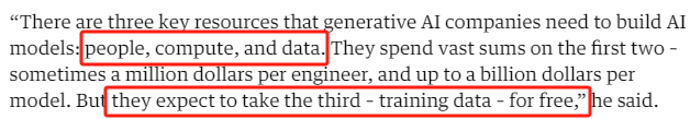 《卫报》在一篇报道中采访了前人工智能公司Stability AI高管埃德·牛顿-雷克斯,他指出,生成式人工智能公司建立人工智能模型需要三种关键资源——人员、计算和数据。雷克斯指出,一些公司在前两者上花费巨资,有时在一个工程师身上花费超100万美元,而每个模型花费高达10亿美元,但却希望免费获得训练数据。