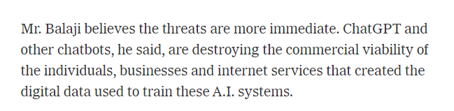一些研究人员则认为这种威胁更为直接。据《纽约时报》报道,曾在OpenAI担任人工智能研究员近4年的苏希尔·巴拉吉表示,Chat GPT和其他聊天机器人正在摧毁个人、企业和互联网服务的商业生存能力,而恰恰是这些个人、企业等创造了用于训练人工智能系统的数据。巴拉吉表示,“对整个互联网生态系统来说,这不是一个可持续的模式。”